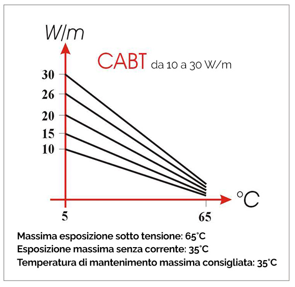 I cavi scaldanti autoregolanti a bassa temperatura CABT sono costituiti da un elemento riscaldante in materiale plastico semiconduttivo che adatta la sua potenza termica (W/m) in ogni punto in base alla temperatura locale. Questa caratteristica intrinseca dell’elemento riscaldante semiconduttivo permette quindi, in alcuni casi, di eliminare la necessità di un sistema di controllo (autoregolazione).